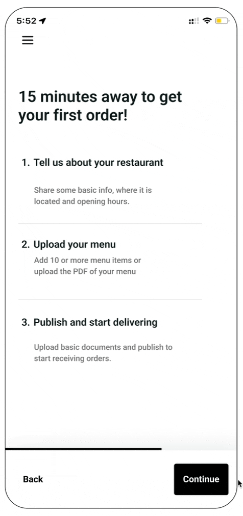Now users can easily list their restaurant on their own and start receiving orders immediately. Progressive disclosure ensured that the onboarding experience is not overwhelming and users could accomplish their goal in 15 to 30 minutes.